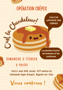 Fêter la Chandeleur! Chacun est invité à apporter des crêpes et la paroisse prévoira les boissons et les confitures.